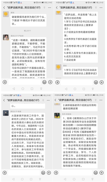 活动围绕学习《习近平总书记在决战决胜脱贫攻坚座谈会上重要讲话》精神。为让大家进一步掌握脱贫攻坚的相关知识,了解疫情防控时期就业形式和最新招聘政策,帮助同学们科学合理制定未来规划,提高青年学子的政治敏感度,把握国家大政方针政策,支部党员教师就疫情期间的就业形势和最新招聘政策作了详细讲解。与会成员还针对脱贫攻坚战的相关话题展开了激烈讨论,各抒己见。学生干部代表、优秀考研考公学生代表、参军入伍学生代表分别就各自成功经验做了分享。