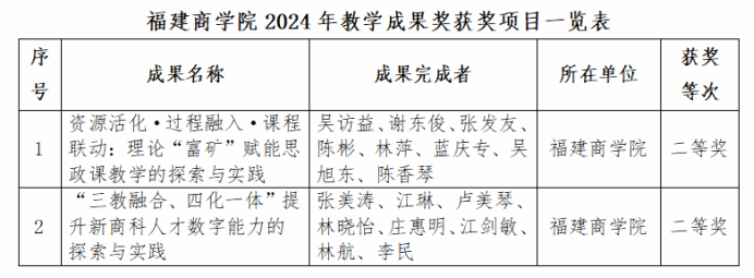 近日,福建省教育厅发布了《关于公布2024年省级教学成果奖获奖成果的通知》,我校在本次评选中取得优异成绩,共获批2项省级教学成果二等奖。其中,由我院院长张美涛教授领衔申报的《"三教融合、四化一体"提升新商科人才数字能力的探索与实践》项目荣获二等奖,标志着我院在本科教学成果建设方面实现了突破。
