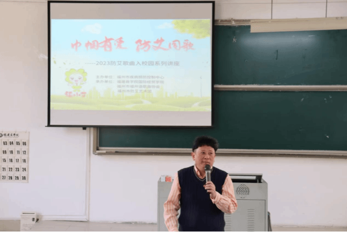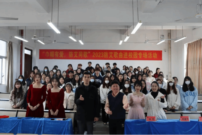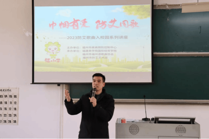 福州市疾病预防控制中心防艾科科长张宏为同学们作防艾知识主题宣讲,详细讲解艾滋病的临床表现、传播途径以及预防措施等基本常识。福州市福州语歌曲协会主席、福州市防艾艺术团执行团长赖董芳向同学们介绍推广了五首防艾歌曲,将防艾知识融入艺术创作,让同学们接受了一场别开生面的艾滋病预防教育。现场还开展了防艾知识问答和互动表演,我院歌手队的6名同学演绎了赖董芳老师创作的防艾歌曲《我不艾》,声情并茂的表演,将现场气氛推向高潮。