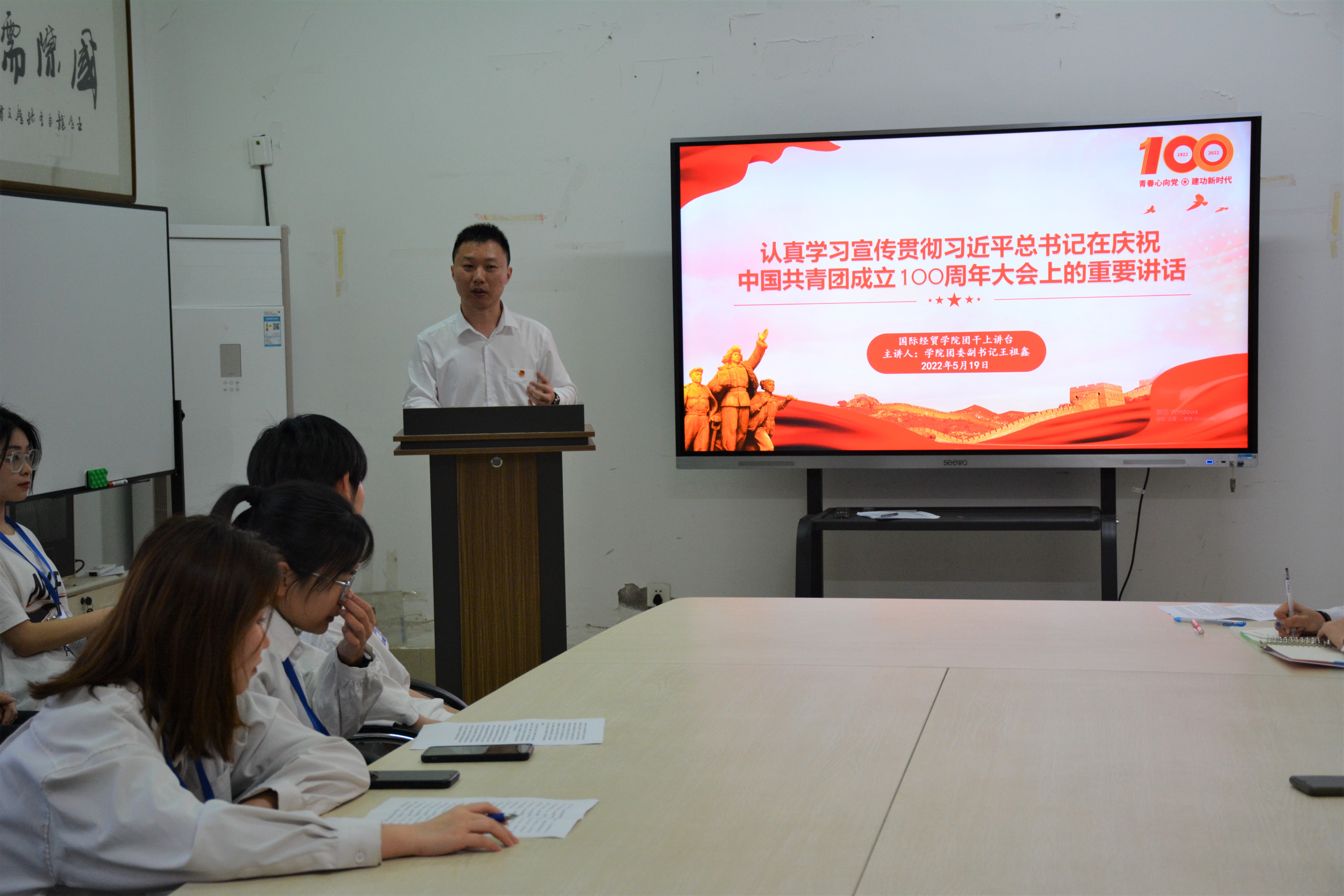 为进一步深入学习宣传贯彻习近平总书记在庆祝中国共产主义青年团成立100周年大会上的重要讲话精神,5月19日,太阳成集团tyc41183团委开展“团干部上讲台”活动,学院团委副书记王祖鑫对习近平总书记在庆祝中国共产主义青年团成立100周年大会上的重要讲话进行领学。
