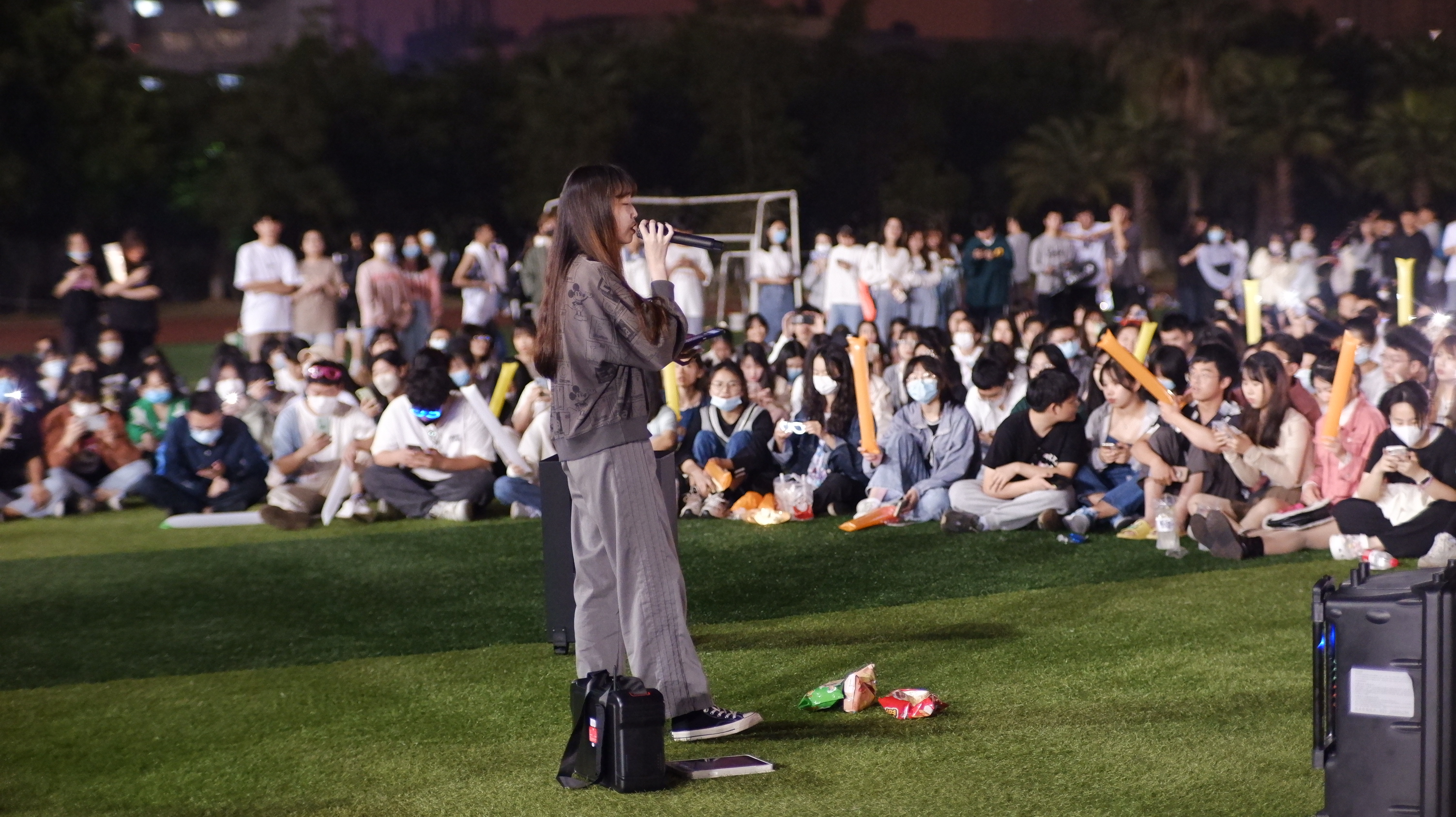 橘红的夜幕下,草地与音乐相伴,四面灯光将操场点亮。在同学们的掌声和欢呼声中,草坪音乐会正式拉开帷幕。活动不设座位,可坐可站,轻松愉悦。开场一首《But You》以振奋人心的鼓点引爆全场,随后的抒情歌曲带同学们领略音乐之美。舞台上的歌手们用饱满的热情和动听的歌声,呈现出一场精彩纷呈的视听盛宴:“花发多风雨,人生足别离”的《你还要我怎样》;“直面青春,勇敢去闯”的《Yes OK》;“温情似水,饱含雀跃”的《等你下课》;还有经典大合唱的活跃曲目《最炫民族风》。
