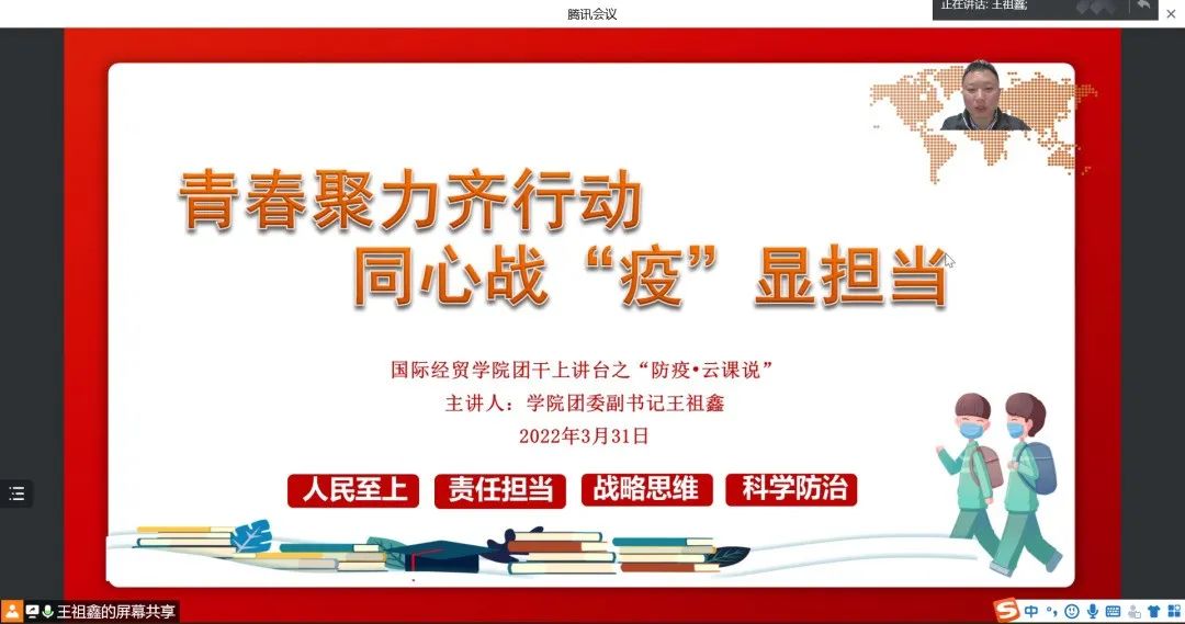 当前疫情防控形势复杂严峻,为积极响应校团委开展“请党放心‘疫’线有我”共青团抗击疫情专项行动,3月31日,太阳成集团tyc41183团委组织开展“防疫•云课说”,通过线上会议的形式,讲好抗疫思政课。学院团委副书记王祖鑫老师主讲,团委干部及各团支部负责人参加。