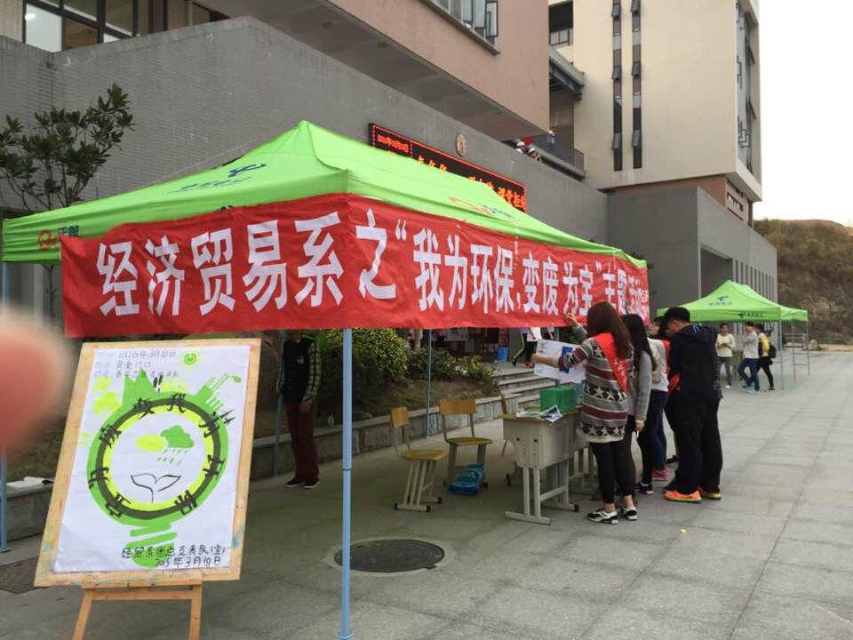 为了进一步提高我校学生的环境保护意识,丰富校园德育内容,争创绿色学校,经济贸易系青年志愿者服务队在食堂门口举办了“我为环保,变废为宝”为主题的宣传活动,让同学们了解更多的环保知识,以及了解更多废物利用的知识。从而来体现同学们对环境现状的忧虑和保护环境、改善环境的急切心情。
