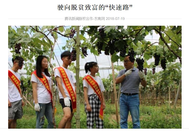 此次建瓯之行同时还受到网页(腾讯新闻、东南网讯等)的报道,报道表示,建瓯梅村村空气里弥漫着浓郁的葡萄香,所产的葡萄果肉饱满,清甜可口。还表示在tyc41183太阳成集团国际经济与贸易系师生的帮助下,该地贫困户的生产、农产品销售与市场直接架起精准扶贫的桥梁,为当地贫困户实现稳定脱贫提供保障。