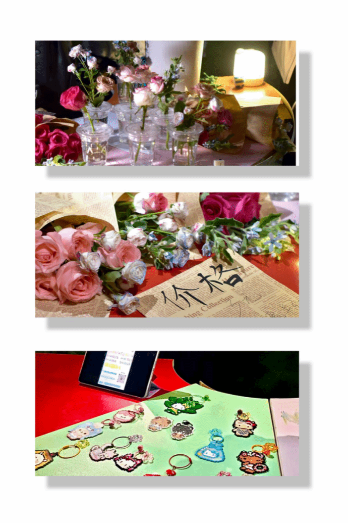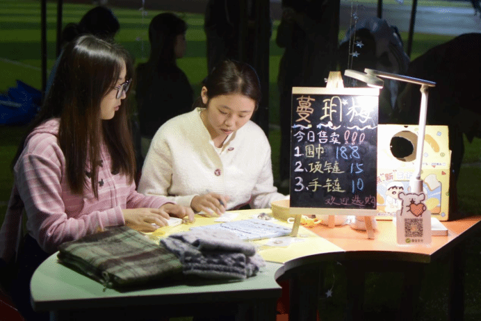 夜市现场气氛热烈,人潮涌动。来自各学院的“摊主”团队各显神通,带来了琳琅满目的创意商品。既有精巧别致的围巾、项链、手链等时尚饰品,也有芬芳怡人的浪漫鲜花,更有充满乐趣、吸引大家动手体验的拼豆DIY摊位…… 这些新奇有趣的摊位吸引了诸多同学驻足围观、积极体验和踊跃购买,现场热闹非凡。