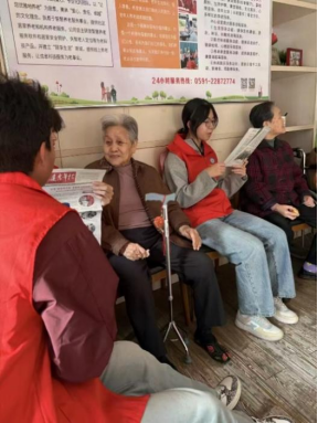 志愿者听爷爷奶奶讲过往故事 志愿者拿起报纸念新闻