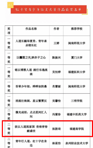 由我院报送的作品《欲以人道筑家国 肯将青春献盛世》(作者:张歆琦,2022级国际商务班)荣获2023年福建省红十字青少年征文大赛二等奖。