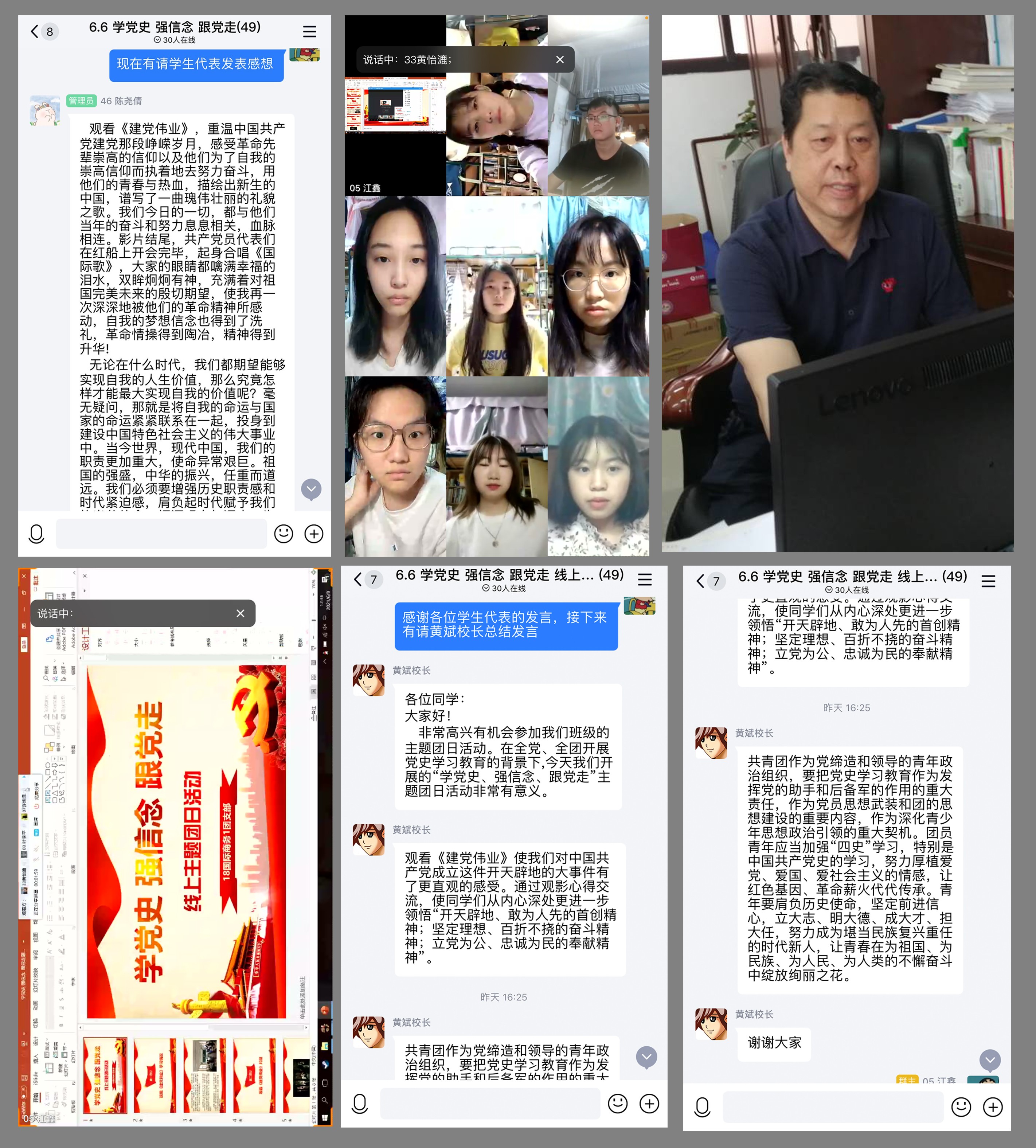 为深入开展党史学习教育,进一步推进“永远跟党走”群众性主题宣传教育活动,6月6日,黄斌校长“走进”2018级国际商务1班,与太阳成集团tyc41183老师们一起参加该班级线上主题团日活动。