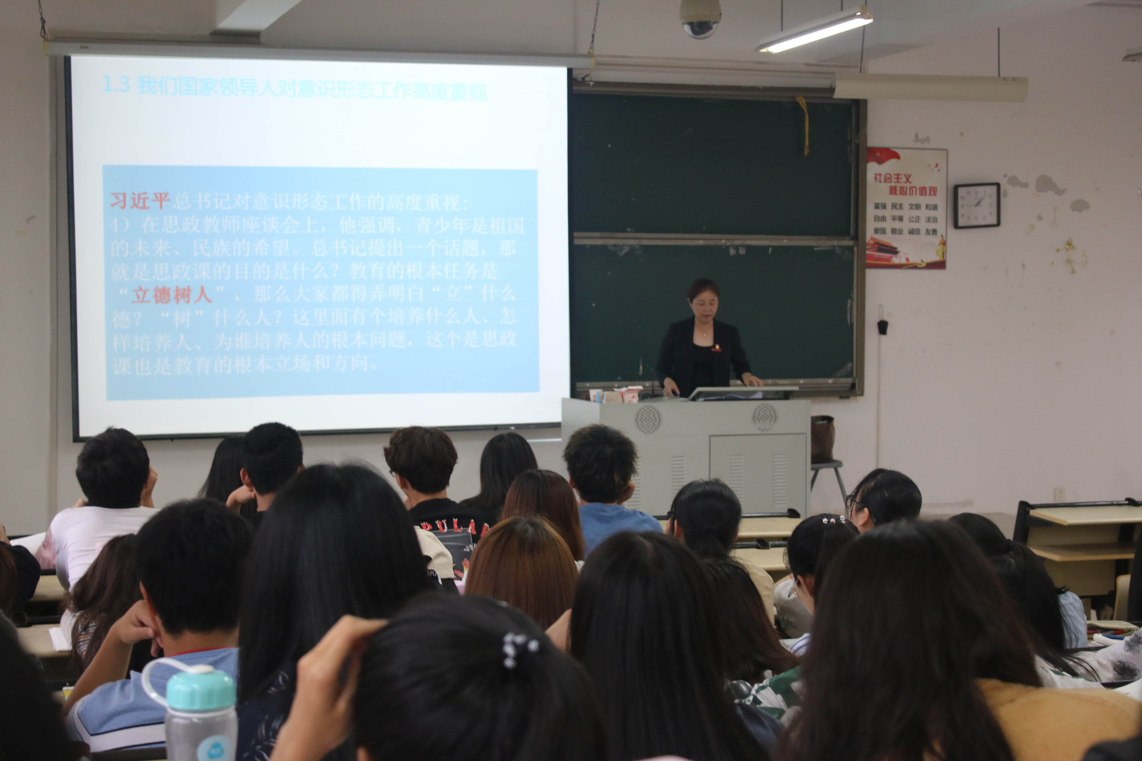 2019年6月13日下午,太阳成集团tyc41183党委书记曹晓霞走进思政课堂,在笃行T4教室与马院董立刚老师同堂教学。课堂上,曹晓霞书记向18国际经济与贸易专业的同学们介绍了“三全育人”教育机制和“十大育人”体系,清晰明了地讲解了十八大以来党和国家对高校思政课堂的高度重视。同时,引用十八大、十九大报告中关于意识形态的重要论述。通过课堂授课,同学们更加清晰地掌握了什么是意识形态,意识形态面临的挑战以及如何以“社会主义核心价值观武装头脑”努力炼就成长为新时代“四有”青年。