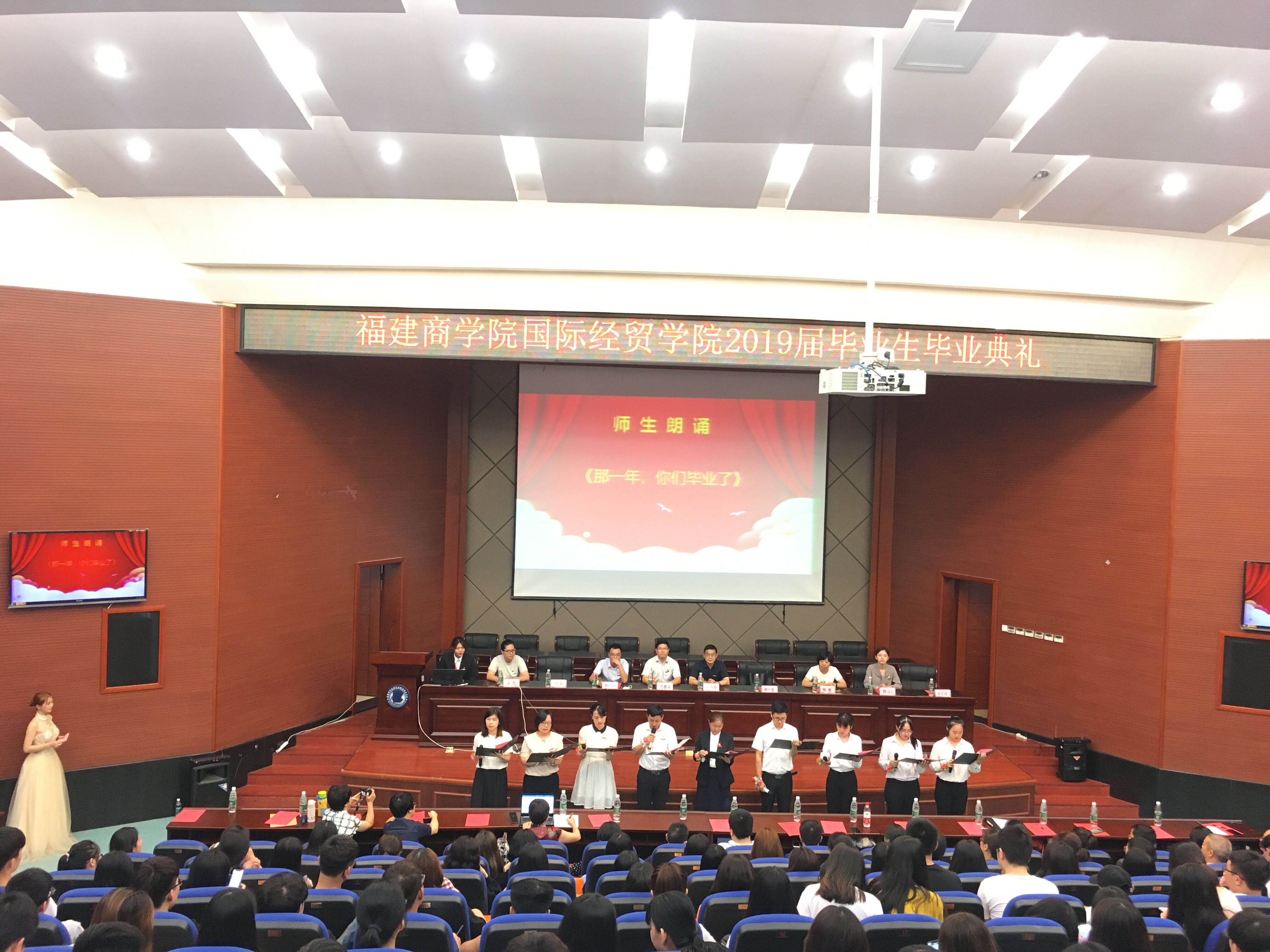 毕业典礼上,师生同台朗诵由18国贸2班金杨倩同学创作的诗歌《那一年,你们毕业了》,院合唱团与在场的毕业班同学一同合唱《北京东路的日子》。三年的大学生活、母校情、师生情、同学情写在诗歌里,融在歌声中,香开在栀子花开的毕业季。