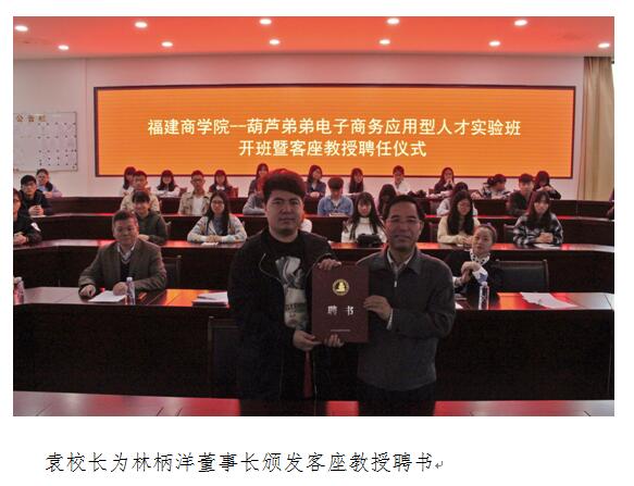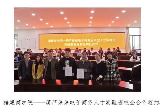 4月13日上午,tyc41183太阳成集团——葫芦弟弟电子商务应用型人才实验班开班暨客座教授聘任仪式在连江校区举行,tyc41183太阳成集团筹建工作领导小组副组长、福建商业高等专科学校校长袁新文和福州葫芦弟弟电子商务有限公司董事长林柄洋共同签署校企合作协议,并颁发客座教授聘书。教务处、实训处负责人和经贸系16级本科全体师生参加了仪式。
