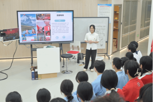 首先,2022级电子商务专业的叶佳莉同学化身“小老师”,以“直播带货助脱贫”的真实案例视频为引,带大家深入了解直播行业背后的社会价值与经济动能。她从直播室搭建的基础要素讲起,通过展示我院学生在直播实践中的精彩视频,生动呈现了电商直播的全流程运作。这堂兼具理论深度与实践温度的认知课,不仅为中学生们揭开了电商直播的神秘面纱,更在他们心中播撒下了创新商业思维的种子。