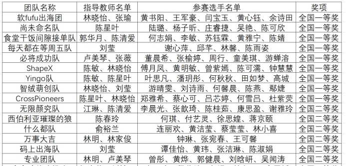 其中,“软fufu出海团”“尚未命名队”“食堂干饭间隙接单队”“每天都在等周五队”“必将成功队”“ShapeX队”“Yingo队”“智绒萌创队”“CrossPioneers”等9支队伍荣获全国一等奖;“无限研究队”“西伯利亚璀璨的狼”“什么都队”“万事大吉”“码上出海队”“专业团队”等6支队伍荣获全国二等奖,充分展现了学院学子扎实的专业素养与卓越的实践创新能力。